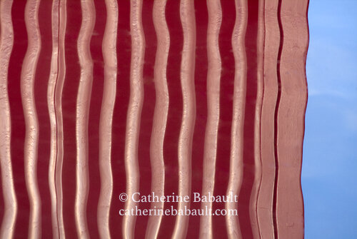 The reflection in the water of a red container and blue sky creates a vibrant abstract composition. Le reflet dans l'eau d'un conteneur rouge et du ciel bleu crée une composition abstraite vibrante.