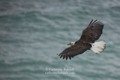 A bald eagle looks for herring during the spawn on the coast of Vancouver Island, British Columbia.