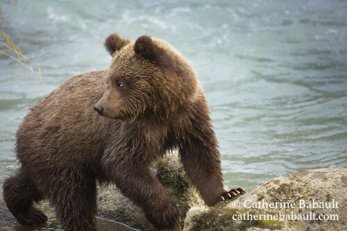 This grizzly bear cub already demonstrating character for its young age by looking over its shoulder to make sure that its mother shares her catches of salmon. Cet ourson grizzli fait déjà preuve de caractère pour son jeune âge en regardant par-dessus son épaule pour s'assurer que sa mère partage ses prises de saumon.