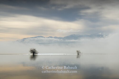 A foggy winter morning in the estuary and mountains in the background, in Comox Valley, Vancouver Island, British Columbia. Un matin d’hiver avec du brouillard sur l’estuaire et des montagnes en arrière-plan, dans la Vallée de Comox, sur l’Île de Vancouver, en Colombie-Britannique.
