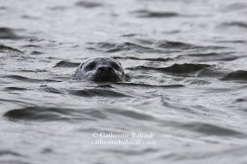 A seal shows some interest in a biped on the shoreline. Un phoque est intéressé par un bipède sur la côte.