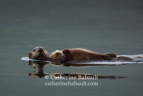 A sea otter pup takes a nap on its mother’s belly in Quatsino Sound. Once extirpated by the fur trade, they were reintroduced on the west coast of Vancouver Island between 1969 et 1972 by the release of 89 sea otters from Alaska. They are currently listed as a species of special concern. Une jeune loutre de mer fait la sieste sur le ventre de sa mère dans le détroit de Quatsino. Extirpées par la traite des fourrures, elles ont été réintroduites sur la côte ouest de l'île de Vancouver entre 1969 et 1972 par l’apport de 89 loutres de mer d'Alaska. Elles sont actuellement répertoriées comme une espèce en situation préoccupante.