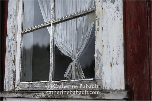 A wooden window with peeling white paint and curtains, part of an old chalet painted red. Une fenêtre en bois avec de la peinture blanche écaillée et des rideaux, partie d’un vieux chalet peint en rouge.