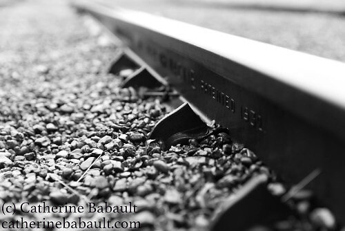 Black and white photograph of a rail and gravel of a disused railway. Photographie en noir et blanc d’un rail et du gravier sur une voie ferrée hors-service.