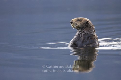 A sea otter enjoys the calm waters on the west coast of Vancouver Island, British Columbia, Canada. Une loutre de mer jouit des eaux calmes de la côte ouest de Ile de Vancouver, Colombie-Britannique, Canada.