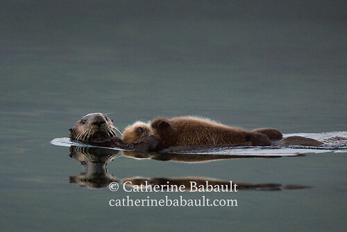 A baby sea otter takes a nap on its mother’s belly in Quatsino Sound. Once extirpated by the fur trade, they were reintroduced on the west coast of Vancouver Island between 1969 et 1972 by the release of 89 sea otters from Alaska. They are currently listed as a species of special concern. Un bébé loutre de mer fait la sieste sur le ventre de sa mère dans le détroit de Quatsino. Extirpées par la traite des fourrures, elles ont été réintroduites sur la côte ouest de l'île de Vancouver entre 1969 et 1972 par l’apport de 89 loutres de mer d'Alaska. Elles sont actuellement répertoriées comme une espèce en situation préoccupante.