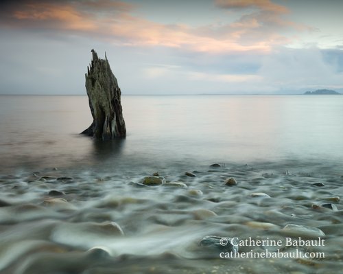 Despite the years and the winter storms, this old tree trunk still stands while the sun sets on the Salish Sea. Malgré les années et les tempêtes d’hiver, le tronc de ce vieil arbre est toujours debout alors que le soleil se couche sur la mer Salish.