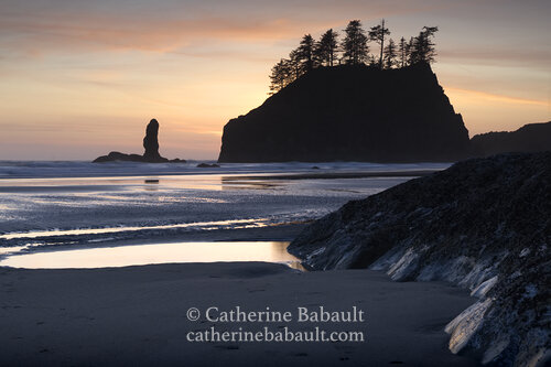 A beautiful sunset on a beach on the Olympic Peninsula in Washington State. Un splendide coucher de soleil sur une plage de la péninsule Olympique, dans l’État de Washington.