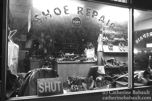 The window of an old shoe repair shop showing scattered shoes and a Shut sign indicating the shop is closed. La vitrine d’une vieille cordonnerie montrant des chaussures dispersées et une pancarte Shut indiquant la boutique fermée.